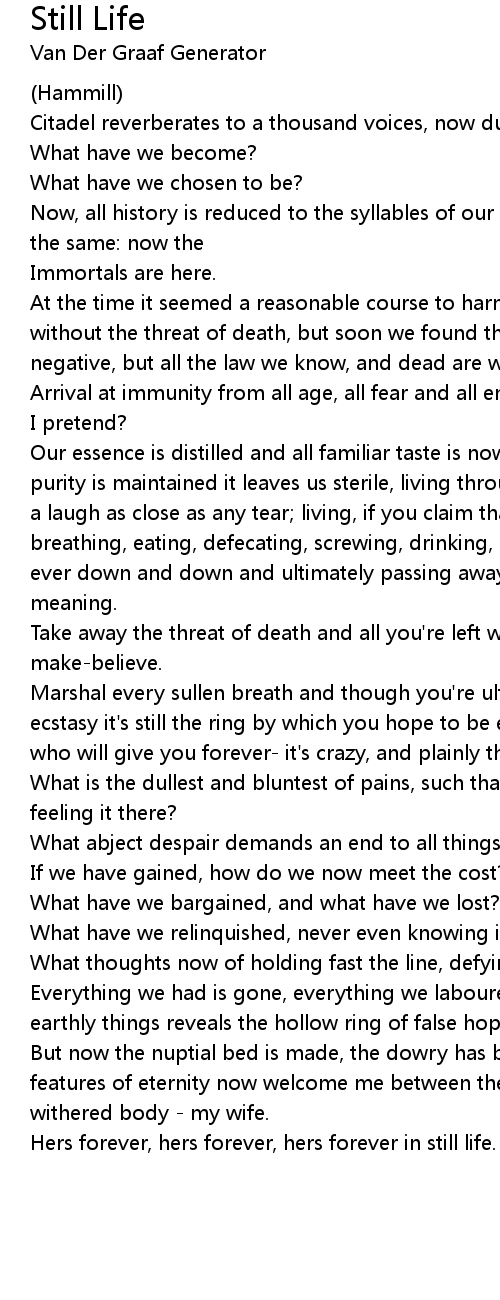 Our essence is distilled and all familiar taste is now drained, and though purity is maintained it leaves us sterile, living through the millions of years, a laugh as close as any tear; living, if you claim that all that entails is breathing, eating, defecating, screwing, drinking, spewing, sleeping, sinking ever down and down and ultimately passing away time which no longer has any meaning. |