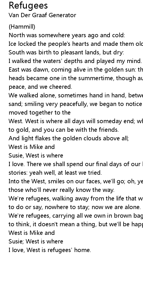 We're refugees, walking away from the life that we've known and loved; nothing to do or say, nowhere to stay; now we are alone. |