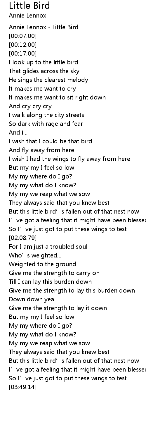 | [03:34.04] | But this little bird’s fallen out of that nest now |