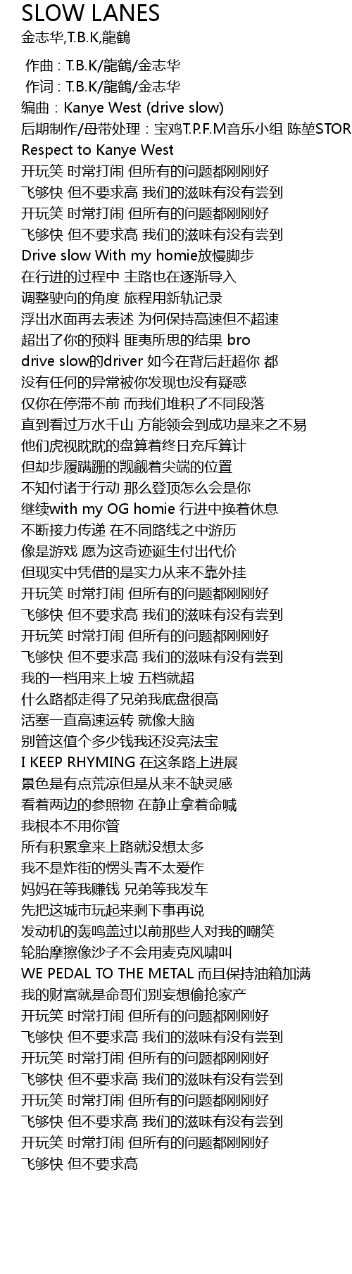 | [00:38.31] | drive slow de driver rú jīn zài bèi hòu gǎn chāo nǐ dōu |