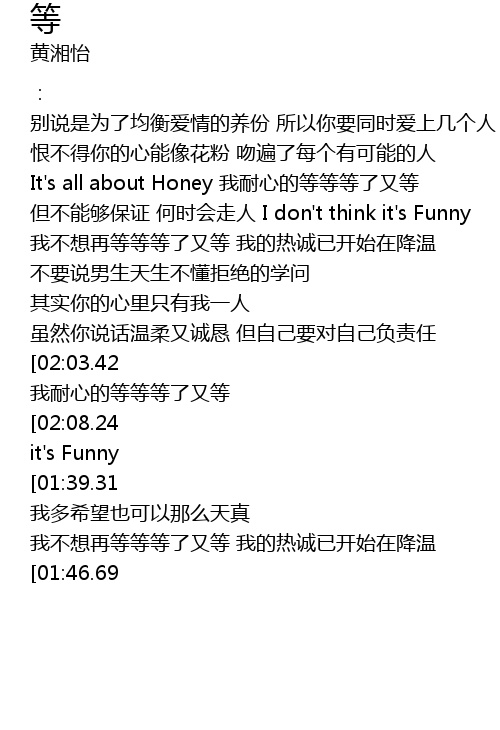 | [02:22.82][02:03.42][01:27.64] | It' s all about Honey wǒ nài xīn de děng děng děng le yòu děng |
