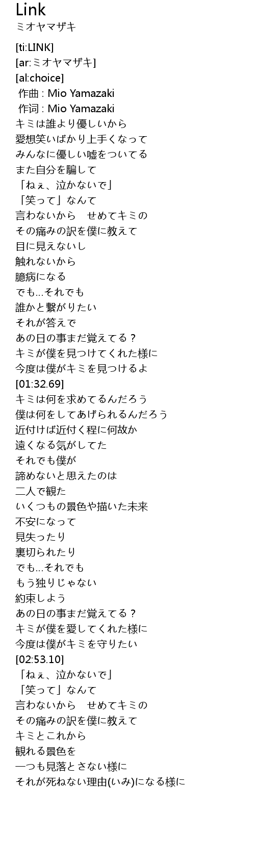 | [00:01.000] | 作词 : Mio Yamazaki |