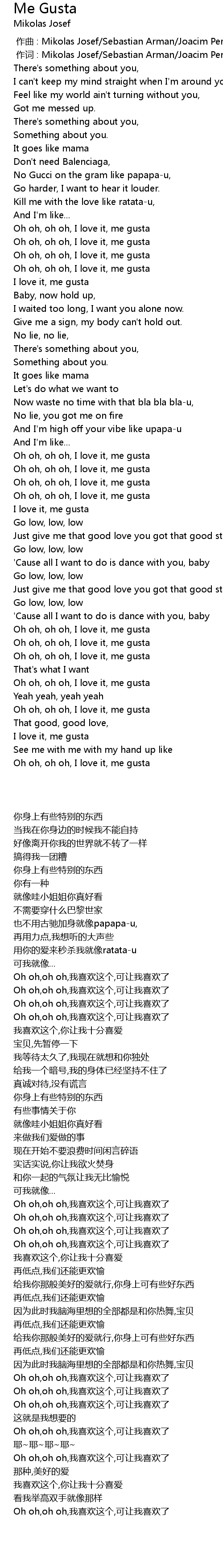| [00:46.85] | Oh oh, oh oh, I love it, me gusta |