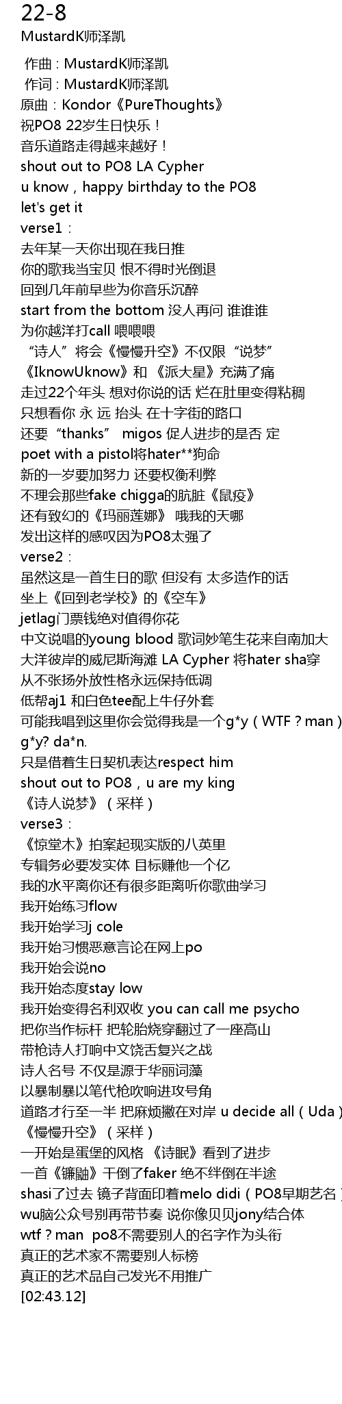 | [00:05.33] | 祝PO8 22岁生日快乐! |