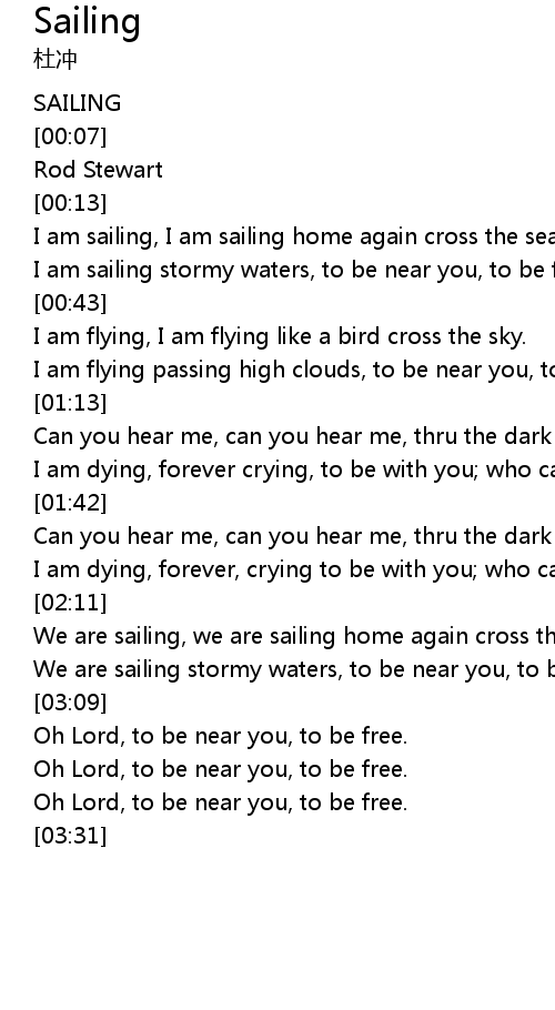 | [00:30] | I am sailing stormy waters, to be near you, to be free. |