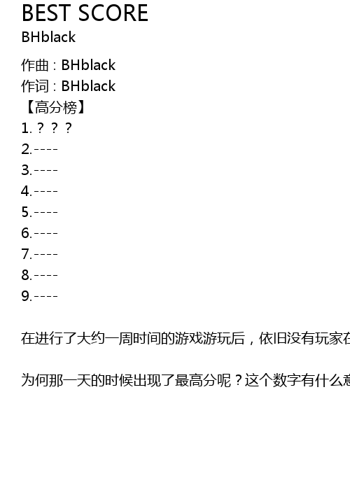 | 在进行了大约一周时间的游戏游玩后,依旧没有玩家在论坛,贴吧,甚至朋友圈里宣布自己通关了游戏,更令人疑惑的是,这些玩家全程保持着不吃不喝不睡的状态进行着游戏流程,任何人都无法将其从游戏状态中拉出来,而就在第9天的时候,全球排行榜上出现了第一个最高分。 | |