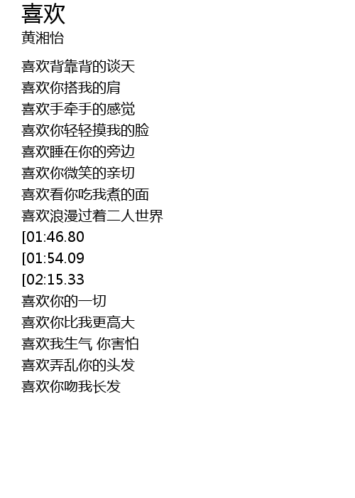 | [02:19.62][02:15.33][01:58.00][01:25.06][00:52.14] | xi huan ni he wo zhi jian |