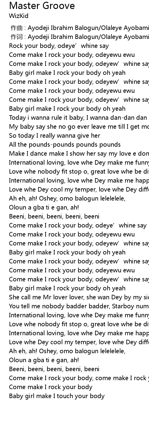 | [00:30.49] | Come make I rock your body, odeyew’whine say |