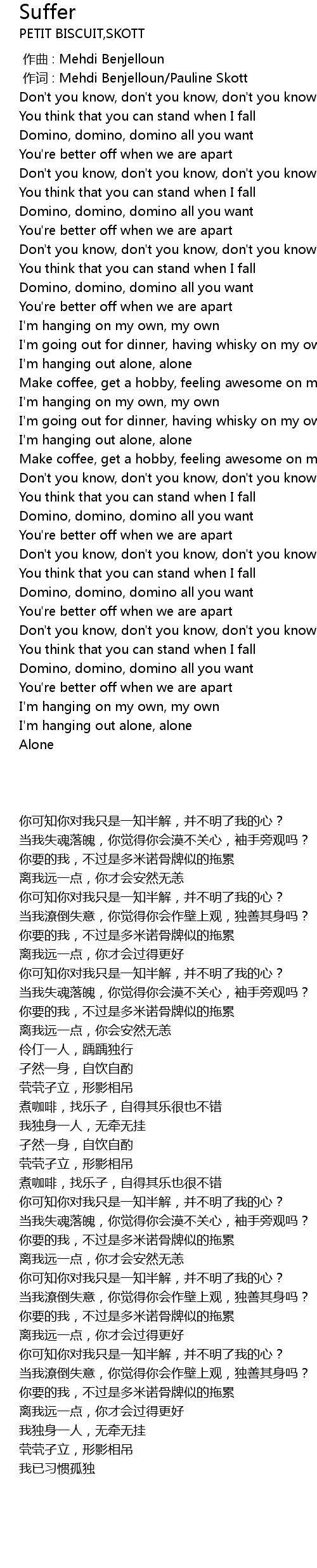 | [01:38.84] | I'm hanging out alone, alone |