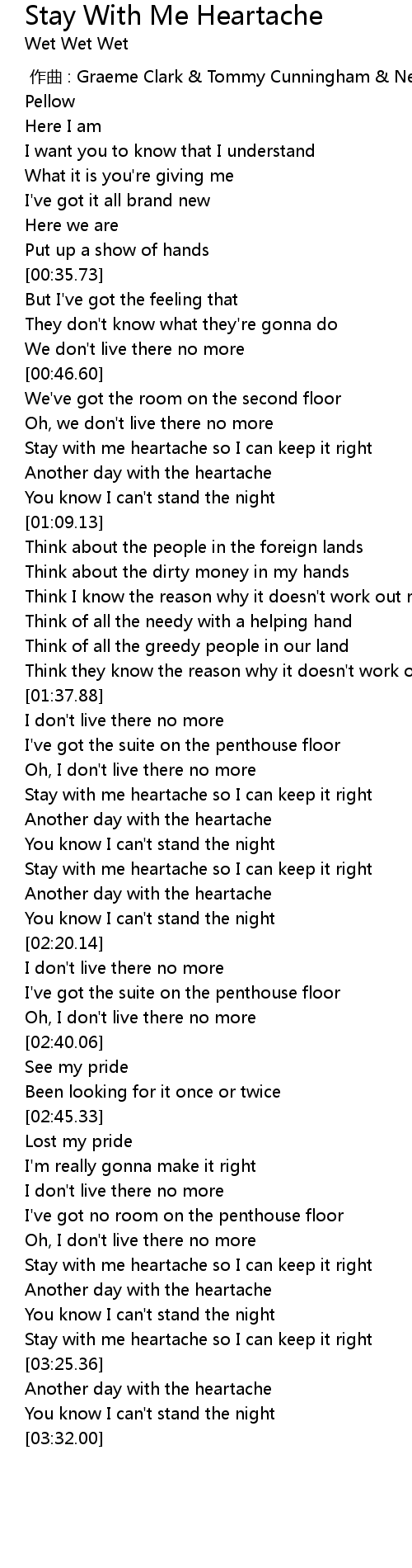 | [00:54.70] | Stay with me heartache so I can keep it right |