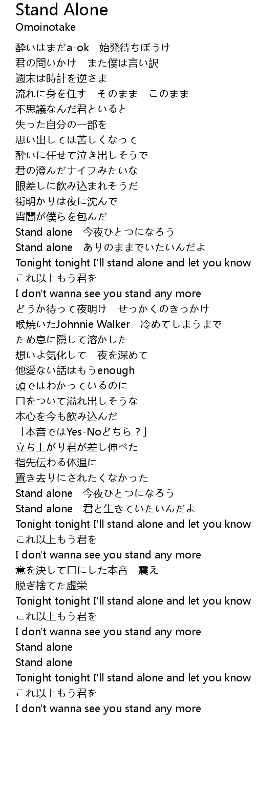 | [02:12.280] | Stand alone 君と生きていたいんだよ |