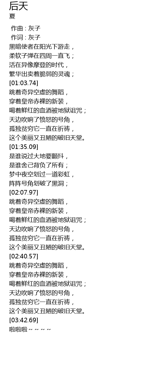 | [03:37.03] | zhe ge mei li you chou lou de po jiu tian tang. |
