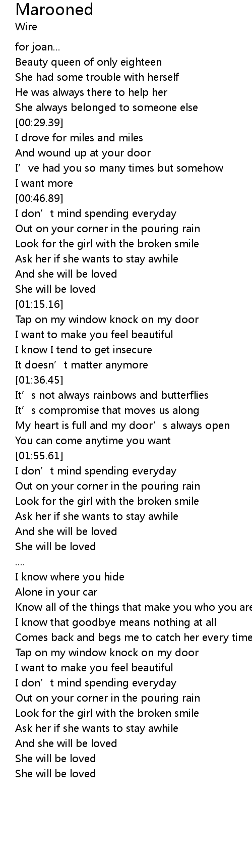| [01:02.73] | Ask her if she wants to stay awhile |