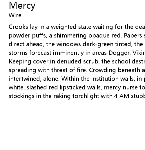 Crooks lay in a weighted state waiting for the dead assassin while the rust pure powder puffs, a shimmering opaque red. Papers spread, no-one driving, we hurled direct ahead, the windows dark-green tinted, the hearse a taxi instead. Snow storms forecast imminently in areas Dogger, Viking, Moray, Forth, and Orkney. Keeping cover in denuded scrub, the school destroyed raised the club, panic spreading with threat of fire. Crowding beneath a layer of foam, refugees intertwined, alone. Within the institution walls, in pastel blue, clinical white, slashed red lipsticked walls, mercy nurse tonight. Seems like dark grey stockings in the raking torchlight with 4 AM stubble, a midnight transvestite. |