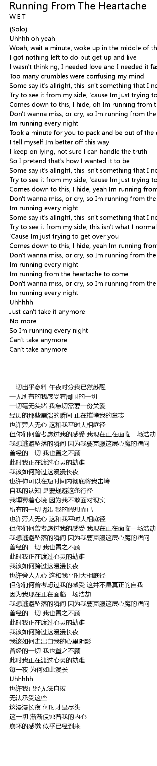 Don't wanna miss, or cry, so Im running from the heartache to come |