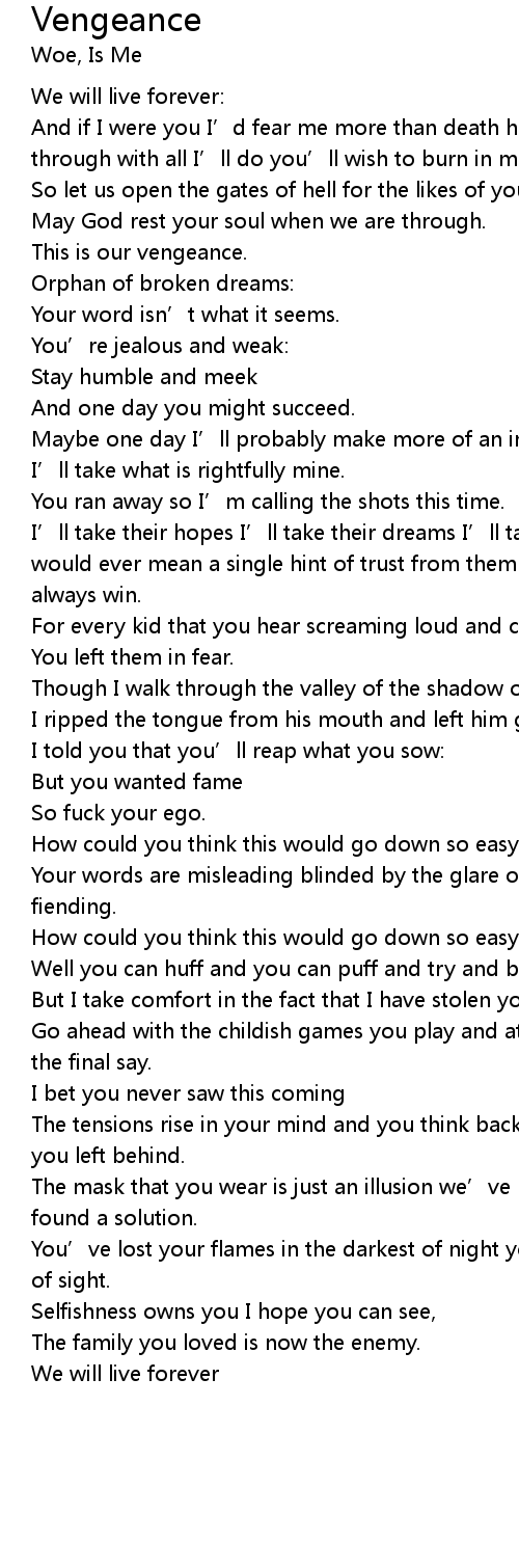 | I' ll take their hopes I' ll take their dreams I' ll take everything that would ever mean a single hint of trust from them you never cared so I will always win. | |