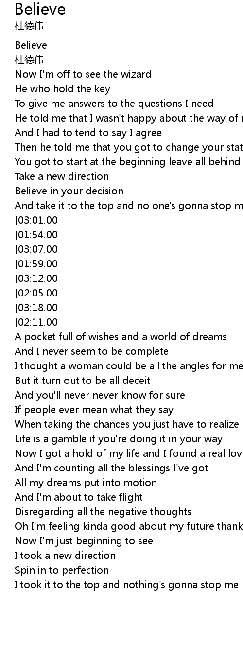 | [03:21.00][02:11.00][01:15.00] | Just as long as I believe in me |