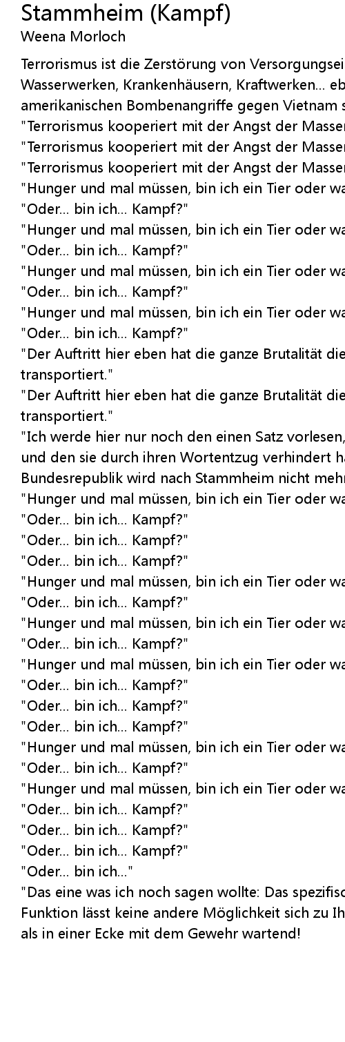 | " Ich werde hier nur noch den einen Satz vorlesen, den Ulrike noch sagen wollte und den sie durch ihren Wortentzug verhindert haben: Die Bundesrepublik... die Bundesrepublik wird nach Stammheim nicht mehr derselbe Staat sein." | |