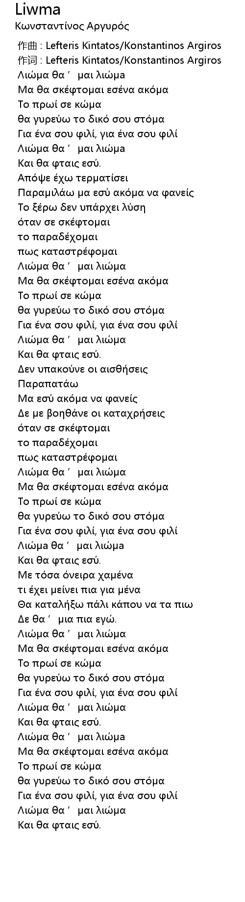 [00:01.000] 作词 : Lefteris Kintatos/Konstantinos Argiros