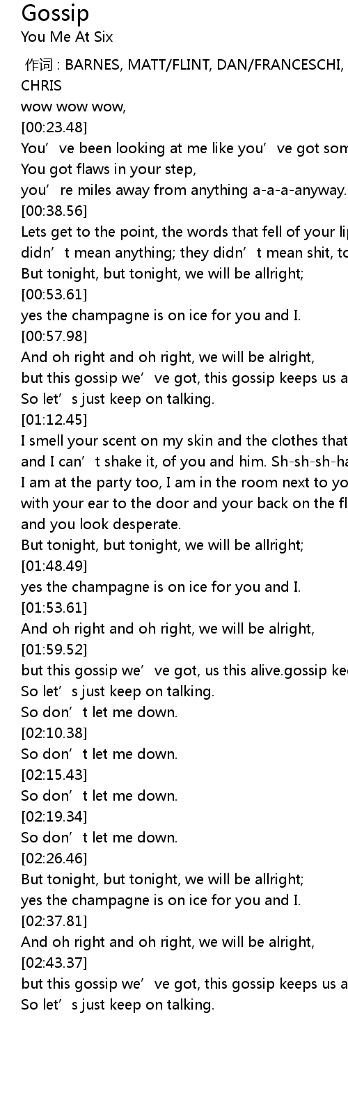 | [02:00.21] | but this gossip we' ve got, us this alive. gossip keeps |