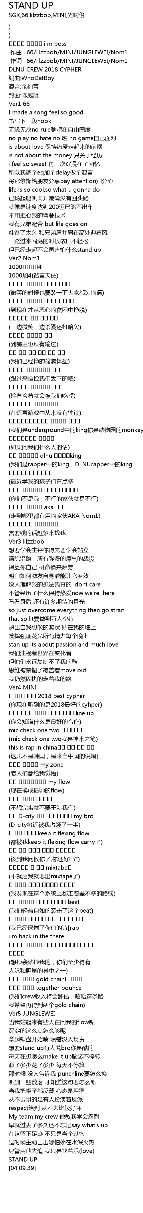 | [03:27.38] | xiǎng yào stand up yǒu rén shuō bro nǐ shì kù de |