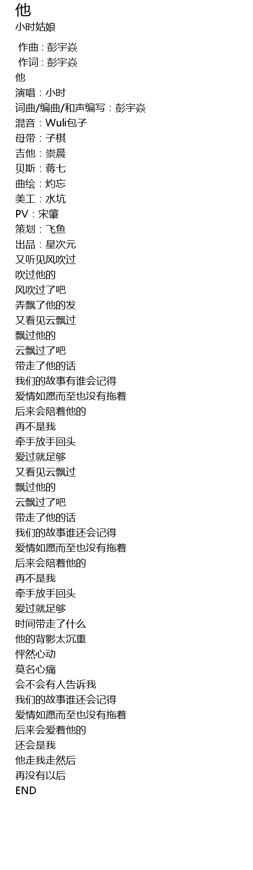 | [00:06.000] | 词曲/编曲/和声编写:彭宇焱 |