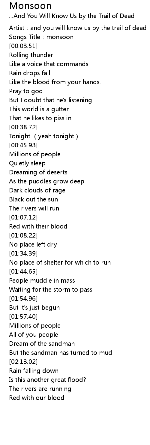 | [00:00.32] | Artist: and you will know us by the trail of dead |