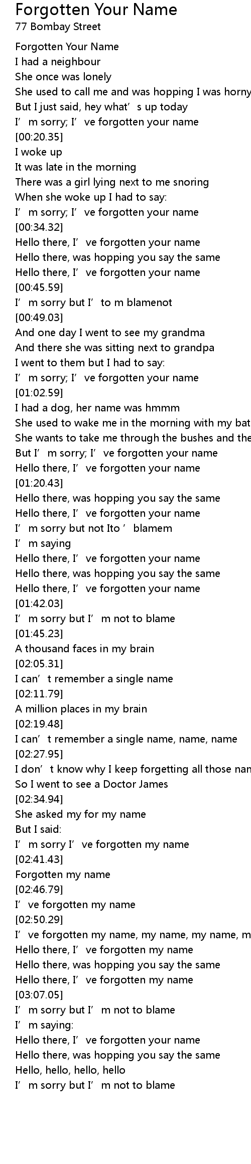 | [03:03.74] | Hello there, I’ve forgotten my name |