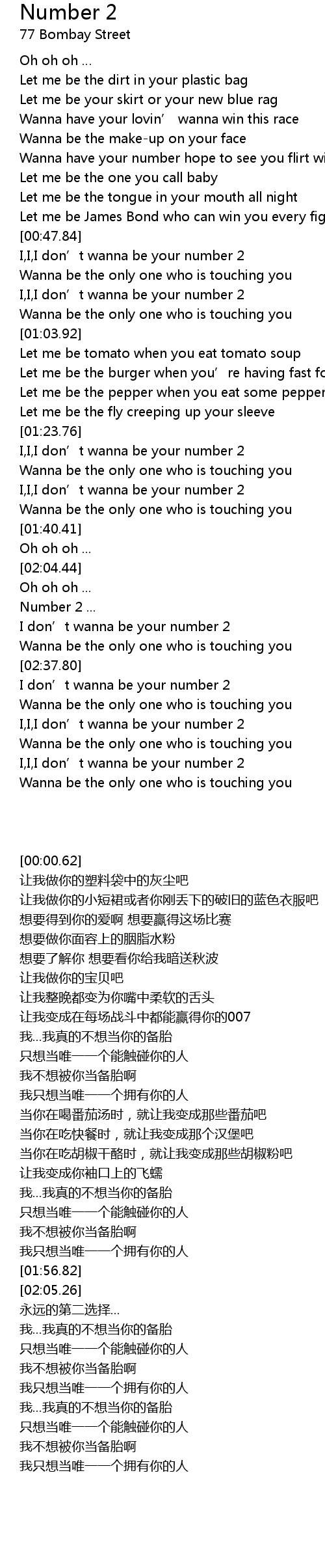| [00:48.52] | I, I, I don' t wanna be your number 2 |