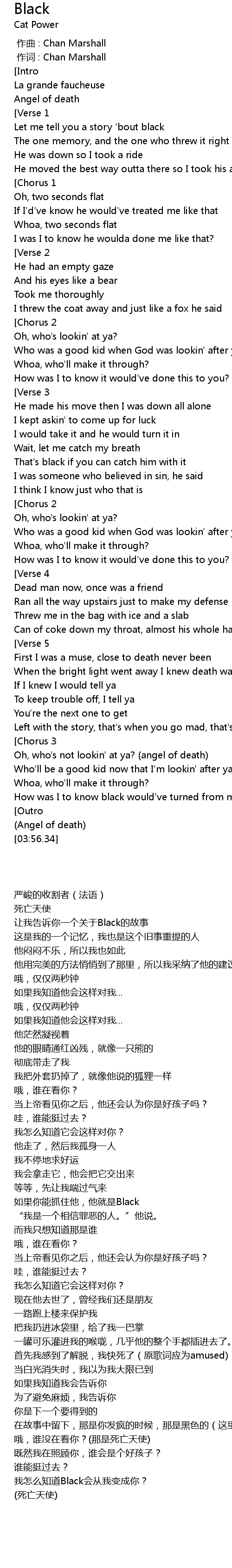 | [03:10.58] | 在故事中留下,那是你发疯的时候,那是黑色的(这里的Black是双关) |