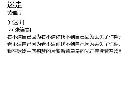 | [02:11.518] | 我在迷途中回想梦的片断看着星星的光芒等候着召唤就是这样初九的夜我从睡梦中醒来火车在途中搁浅没有了祭奠也没有终点徒劳的摇着复杂的圈注定了那里也或能到达在长出翅膀在长出翅膀之前。 |