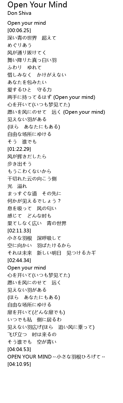 | [04:08.80] | OPEN YOUR MIND~小さな羽根ひろげて~ |