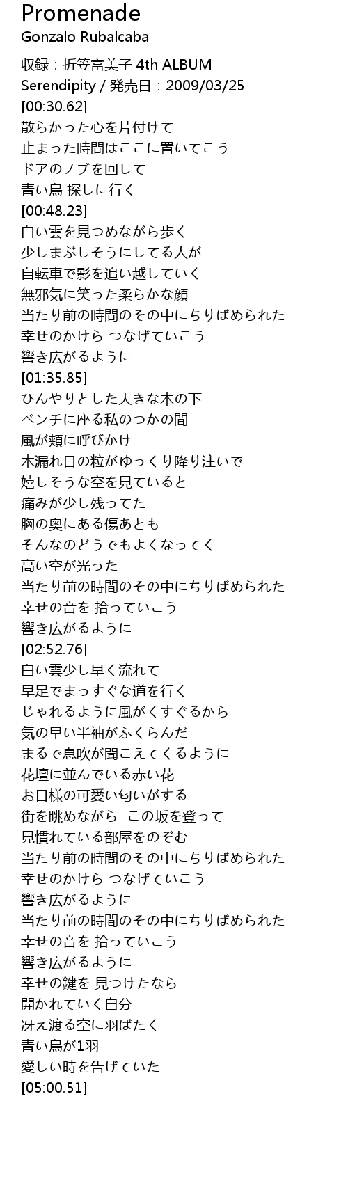 | [00:05.00] | 収録:折笠富美子 4th ALBUM Serendipity/発売日:2009/03/25 |