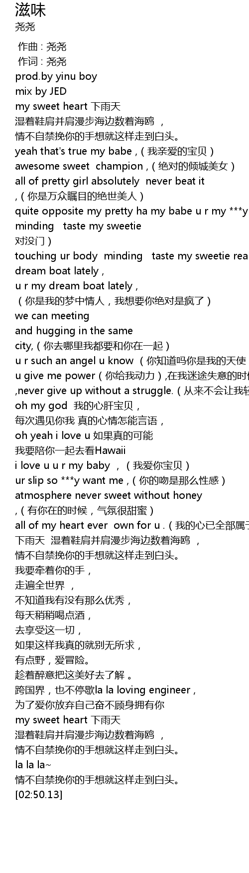 | [00:37.82]quite opposite my pretty ha my babe u r my ***y lady , touching ur body [00:39.82]minding taste my sweetie really.(话说回来我的宝贝虽然动人,但别人妄想绝[00:40.82] | dui mei men |