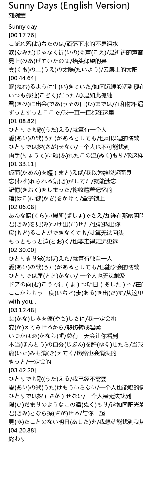 | [00:40.69] | 雲(くも)の上(うえ)の太陽(たいよう)/云层上的太阳 |