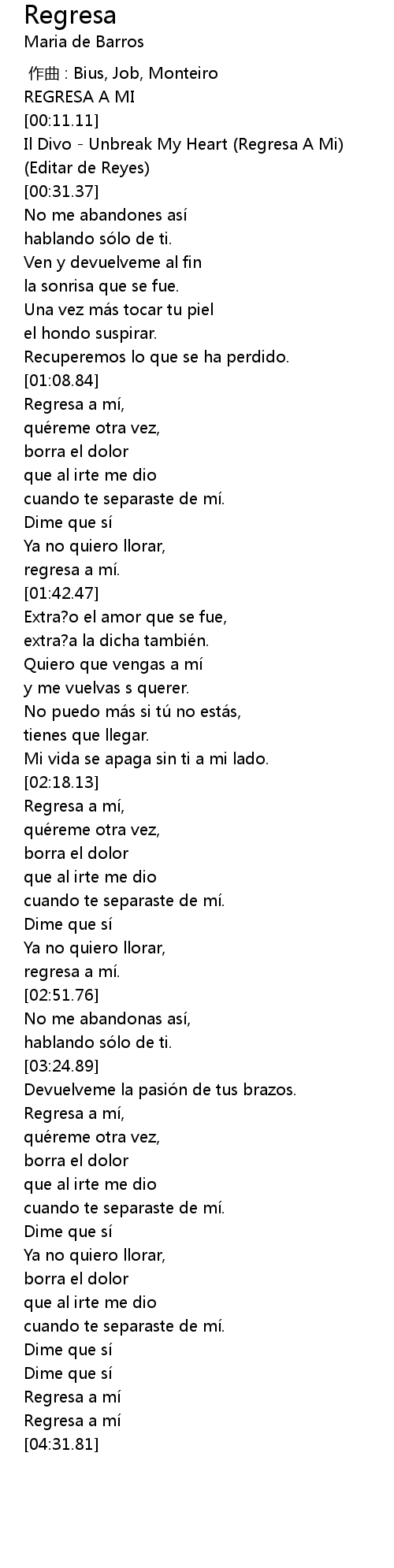 | [00:16.14] | Il Divo - Unbreak My Heart (Regresa A Mi) |