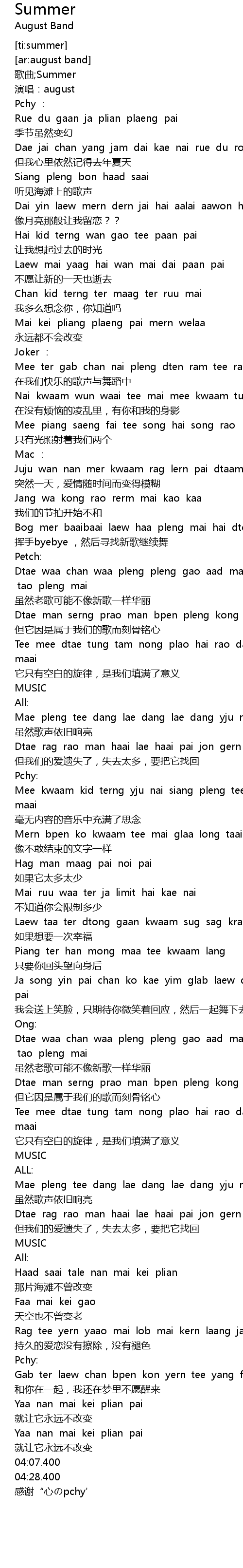 | [02:35.53] | Dtae waa chan waa pleng pleng gao aad mai te mai tan samai tao pleng mai |