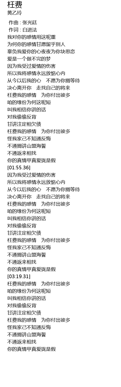 | [03:36.32] | 枉费我的感情 为你付出彼多 |