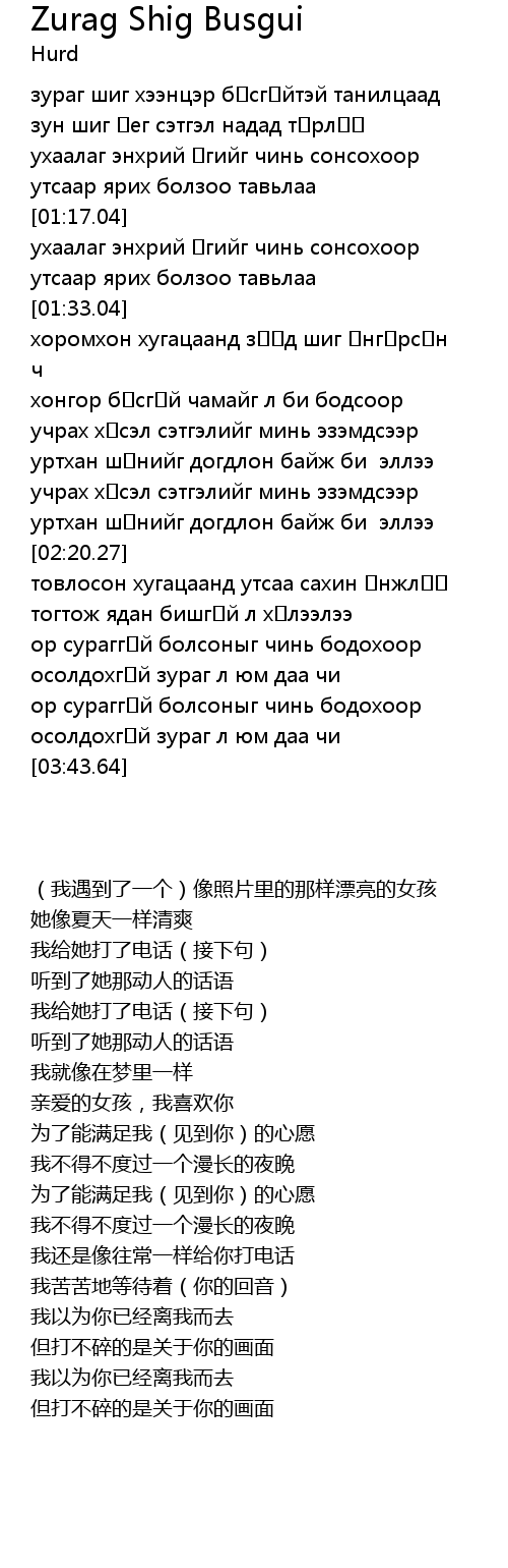 | [01:43.15] | хонгор бүсгүй чамайг л би бодсоор |