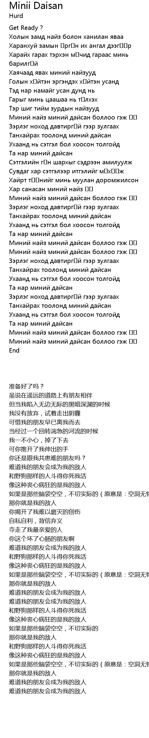 | [01:31.72] | Миний найз миний дайсан боллоо гэж үү |