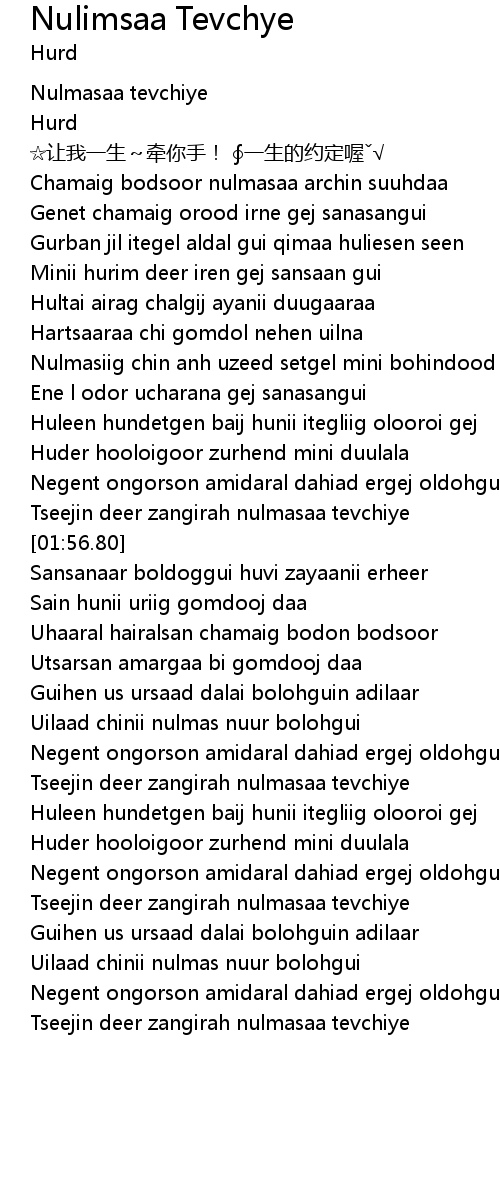 | [01:49.24] | Tseejin deer zangirah nulmasaa tevchiye |