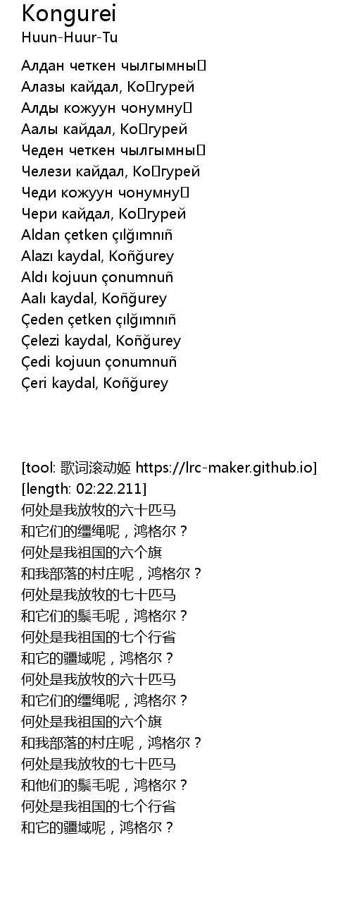 | [00:31.792] | Аалы кайдал, Коңгурей |