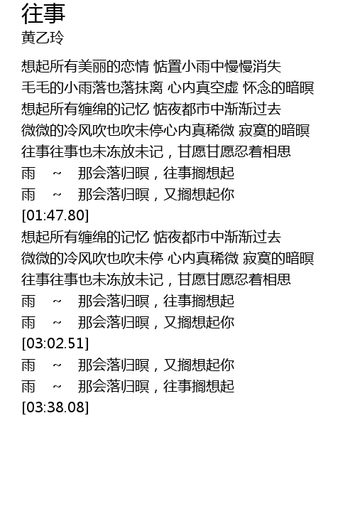 | [02:26.34] | 往事往事也未冻放未记,甘愿甘愿忍着相思 |