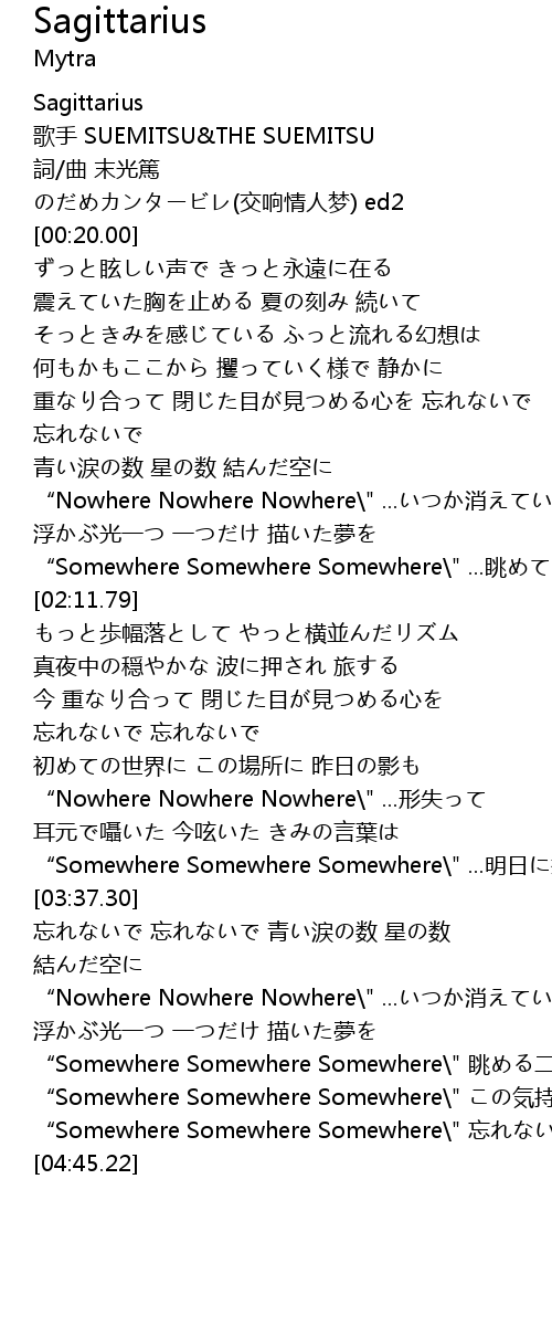 | [04:01.75] | “Nowhere Nowhere Nowhere\" ...いつか消えていく |