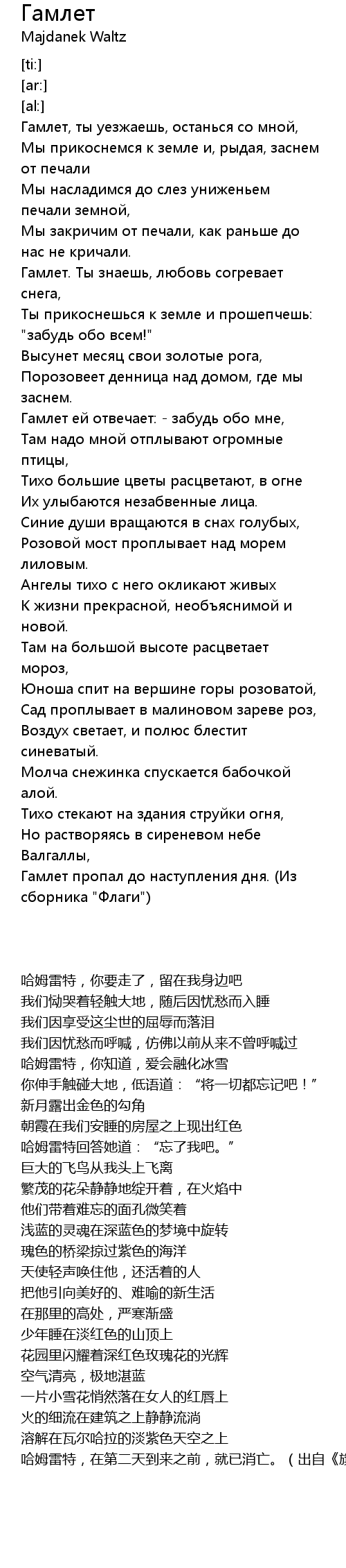 | [03:22.73] | Гамлет пропал до наступления дня. (Из сборника "Флаги") |
