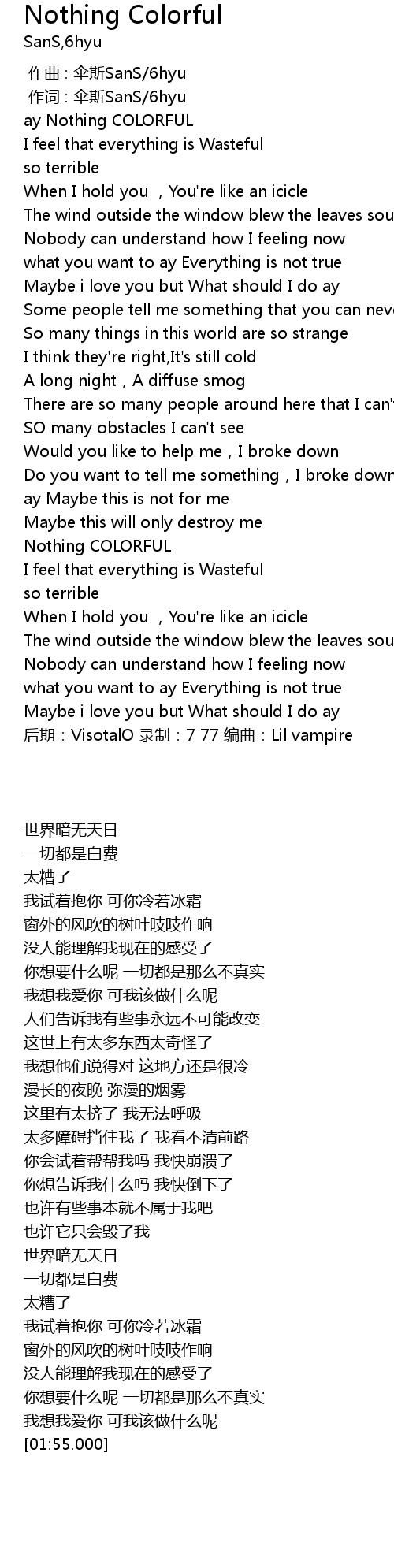 | [01:55.000] | 后期:VisotalO 录制:7 77 编曲:Lil vampire |