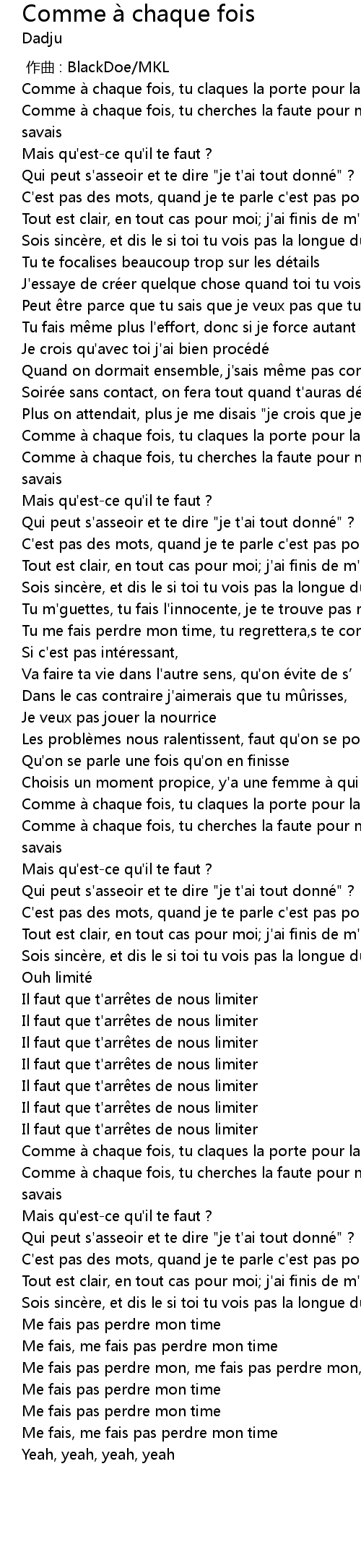 | [03:02.75] | Comme à chaque fois, tu cherches la faute pour m' dire que tu le savais |