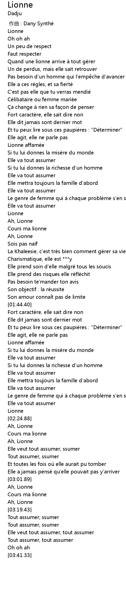 | [00:11.38] | Quand une lionne arrive a tout ge rer |