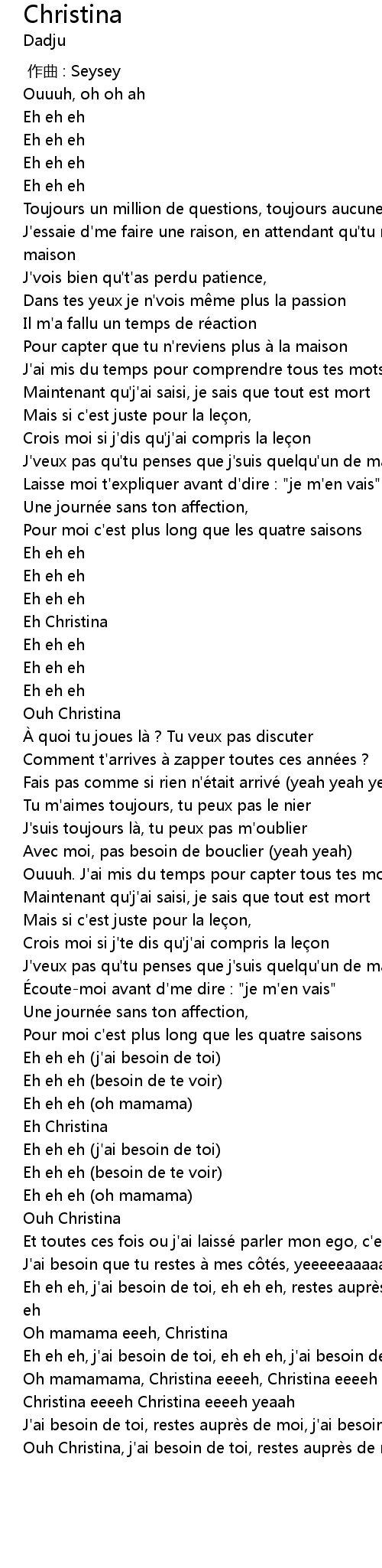 | [03:00.84] | Ouh Christina, j'ai besoin de toi, restes auprès de moi |