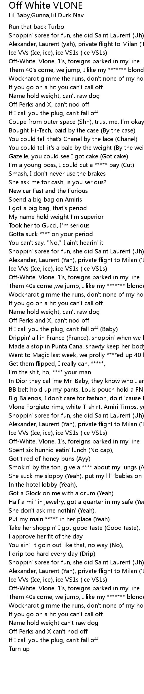 | [01:11.22] | Off-White, Vlone, 1's, foreigns parked in my line |